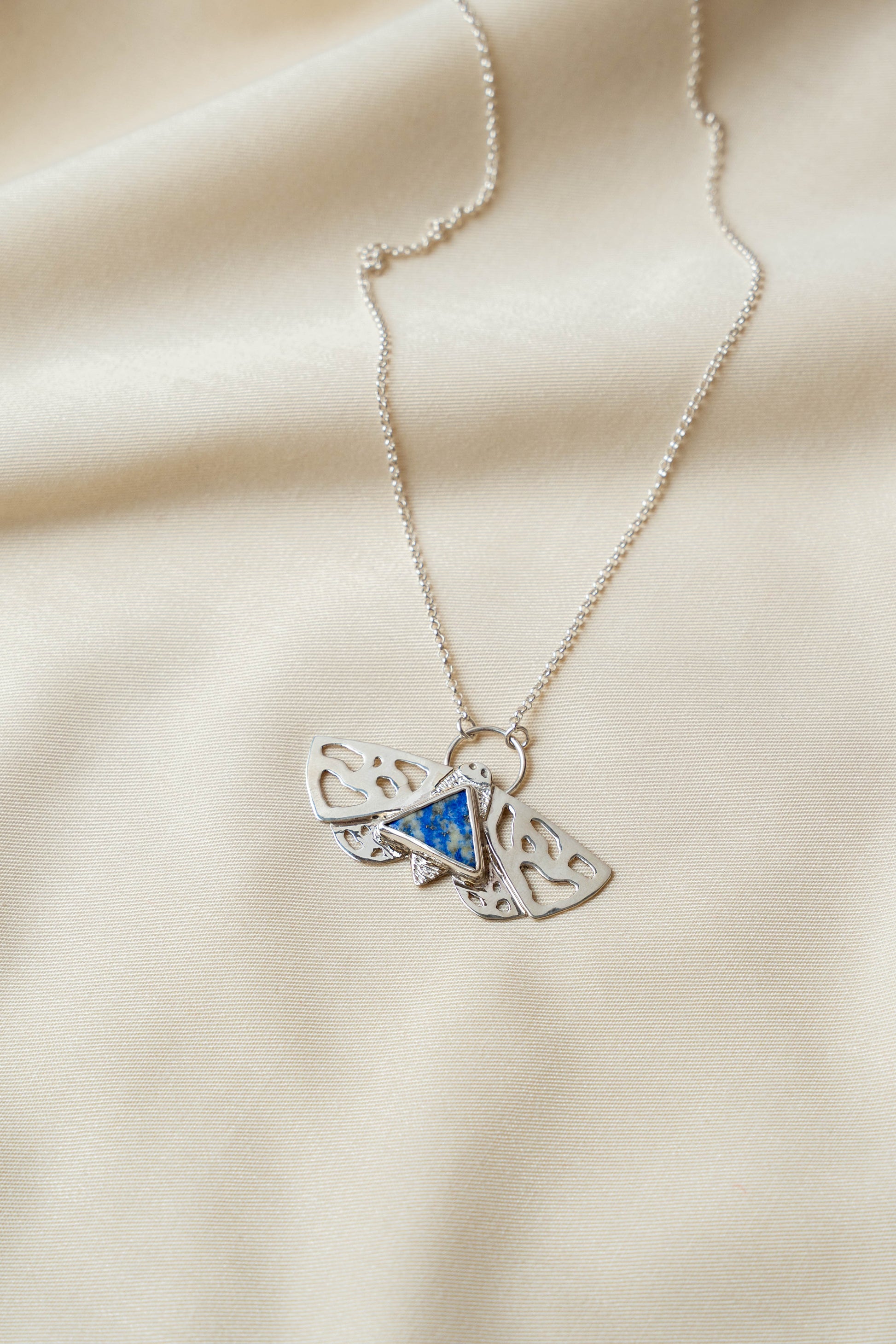 Mariposa is a butterfly necklace with a unique lapis lazuli semi-precious stone. Waving the threads of change. Waiting patiently in silence. Butterflies carry a story of transformation. Fragile and gentle. They embody freedom, spirituality, and personal growth.