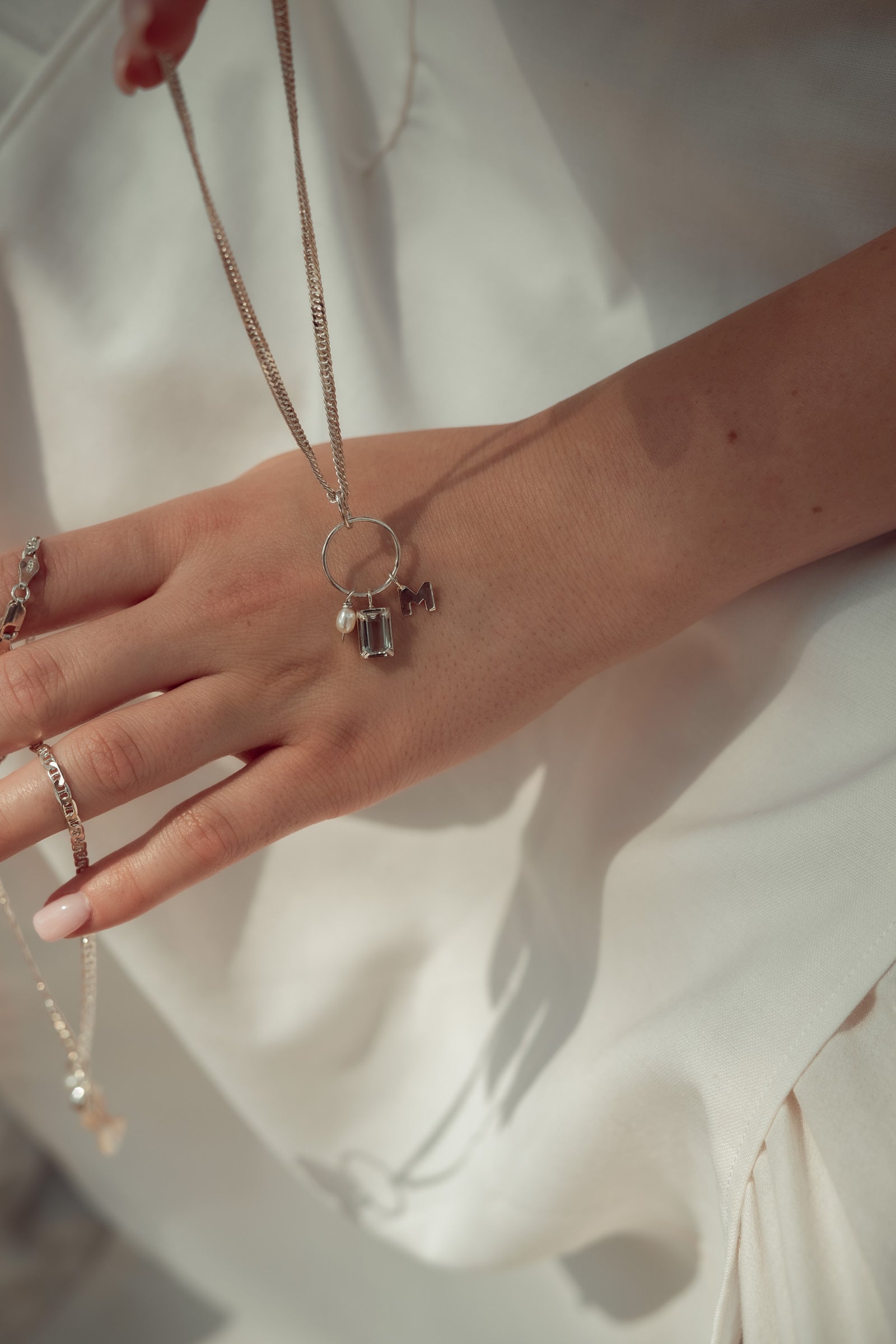 Ensō is a circle shaped pendant. In this version a hanging, emerald cut, aquamarine stone and a small fresh water pearl, adorn the pendant. You can also choose a silver monogram of your choice as an option. Ensō is an ancestral Zen Symbol which means "circle". It is assosiated with enlightenment, emptiness, freedom and the state of no-mind. Aquamarine is known as "the sailor's gem" and reveals the esoteric knowledge of the sea and its secrets.