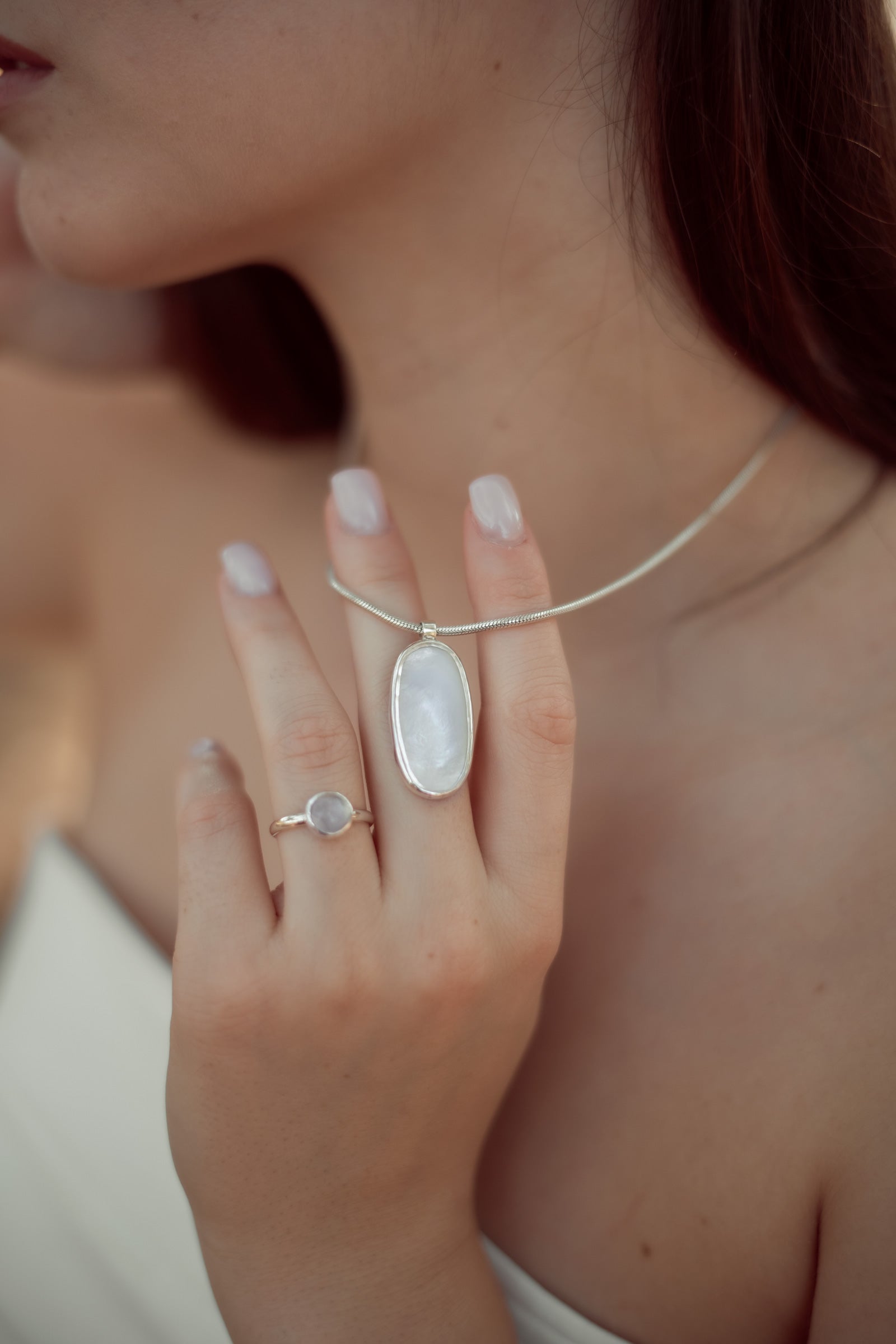 Altair is an oval shaped necklace, referring to the star Altair of the Alpha Aquilae constellation. Its meaning is "flying eagle" or "bird of prey". In this version, the element surrounded by silver, is a "mother of pearl" shell. Oval, is a symbol of wholeness and completion. Embodies the circle of life and represents a unified vision.