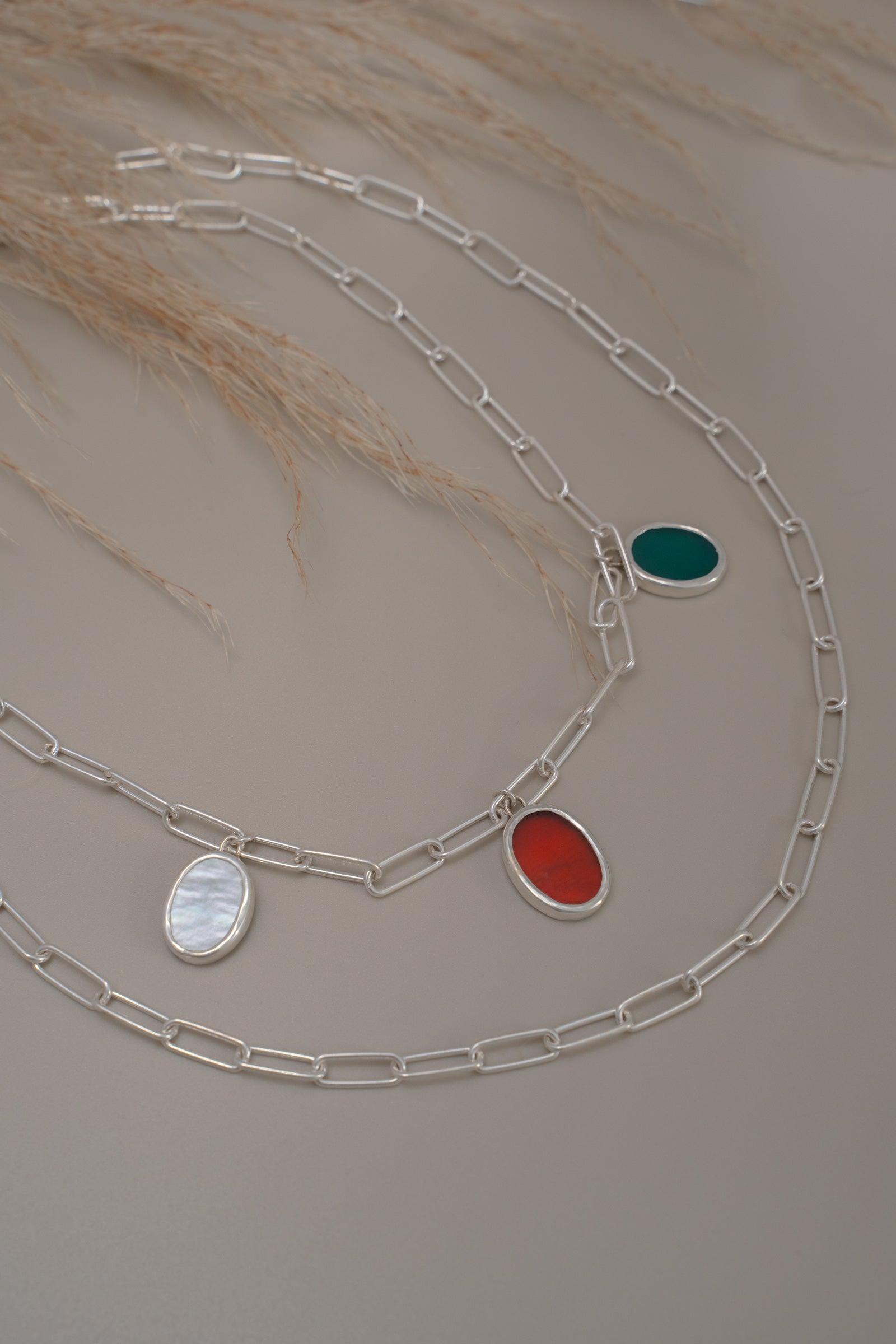 Altair is statement necklace with oval shaped carnelian, green agate semi-precious stones and a "mother of pearl" shell. It is referring to the star Altair of the Alpha Aquilae constellation. Its meaning is "flying eagle" or "bird of prey". In this version, the element surrounded by silver, is an oval shaped deep red carnelian semi-precious stone. Oval, is a symbol of wholeness and completion. Embodies the circle of life and represents a unified vision.