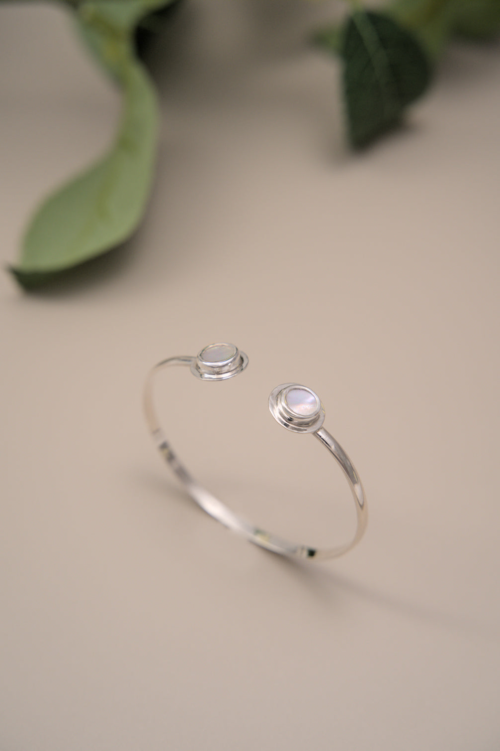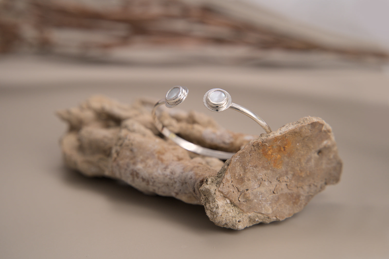 Tainome is a two stone cuff. In this version, the elements surrounded by silver are two round shaped "mother of pearl" shells. Tainome is a kind of typographical bullet in Japan that resembles a "fisheye" ◉. The fisheye is a symbol that signifies insight and awareness. It represents the ability to see beyond the surface and gain a deeper understanding.