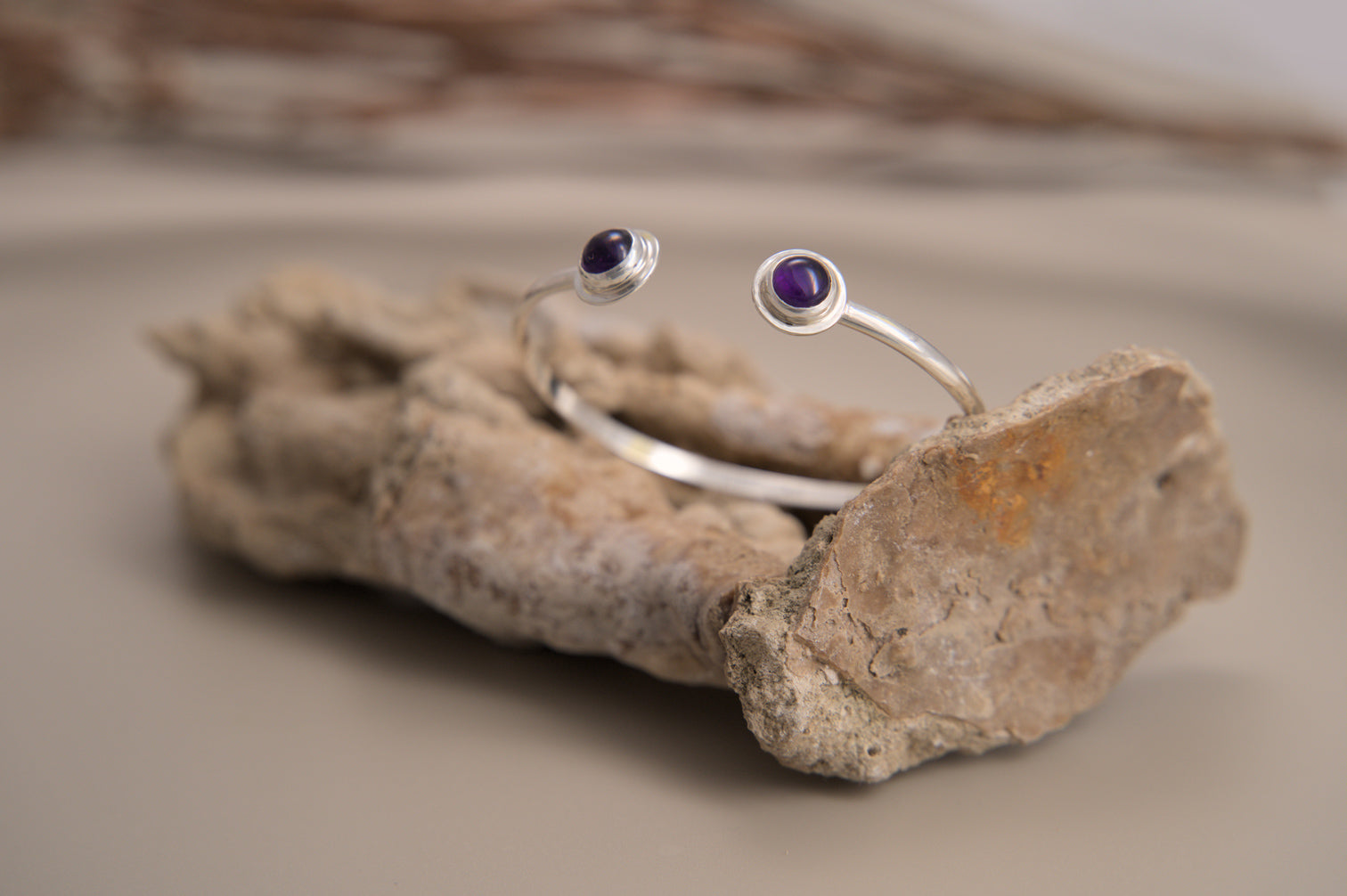 Tainome is a two stone cuff. In this version, the elements surrounded by silver are two round shaped deep purple amethist semi-precious stones. Tainome is a kind of typographical bullet in Japan that resembles a "fisheye" ◉. The fisheye is a symbol that signifies insight and awareness. It represents the ability to see beyond the surface and gain a deeper understanding.