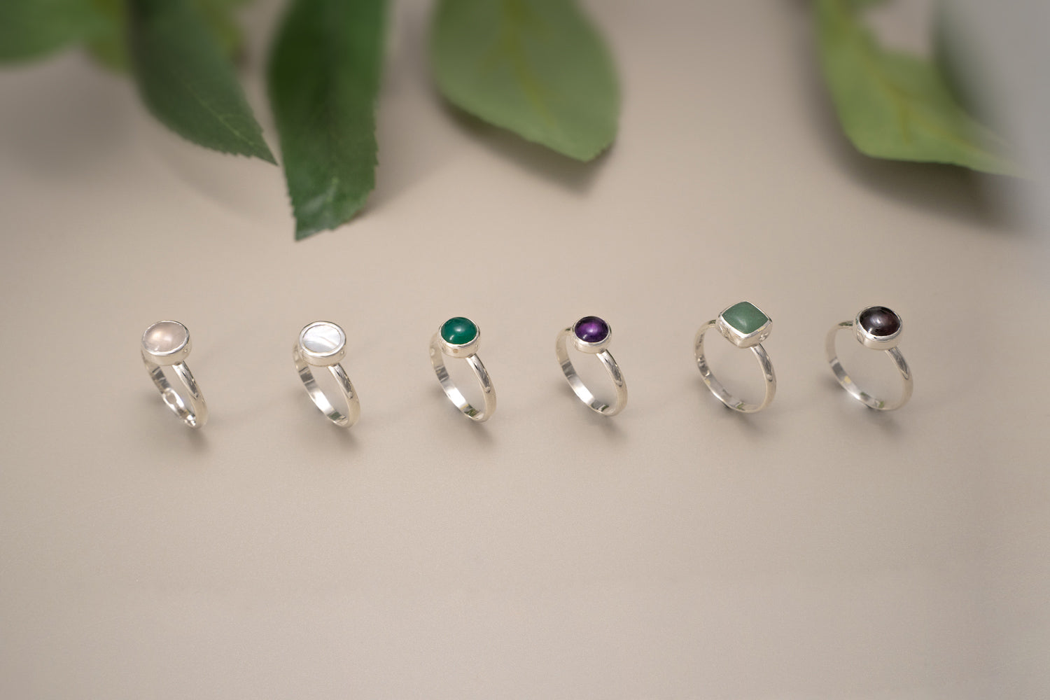 Tainome is a single stone ring. In this version, the element surrounded by silver is a square shaped pale green aventurine semi-precious stone. Tainome is a kind of typographical bullet in Japan that resembles a "fisheye" ◉. The fisheye is a symbol that signifies insight and awareness. It represents the ability to see beyond the surface and gain a deeper understanding.