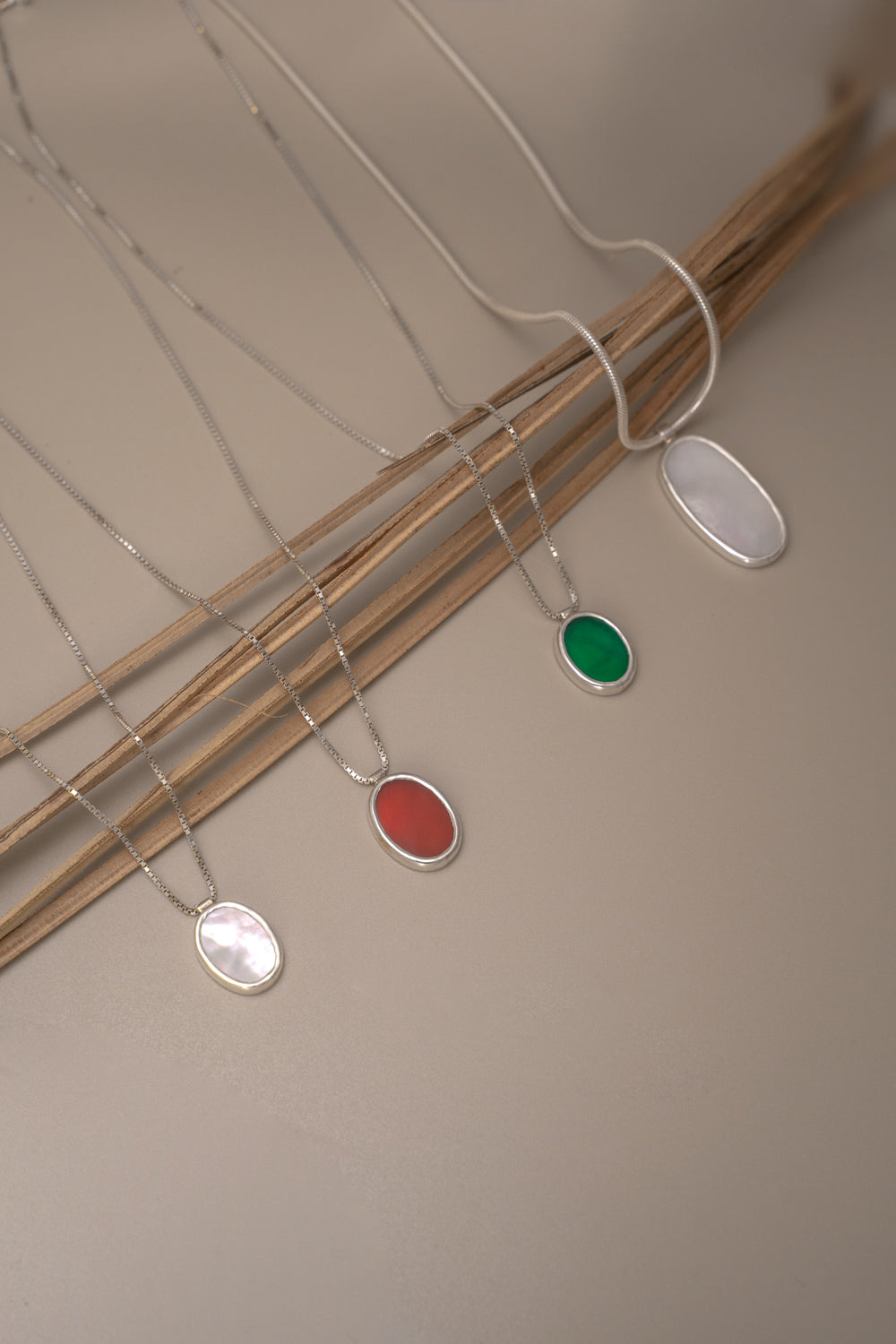 Altair is an oval shaped necklace, referring to the star Altair of the Alpha Aquilae constellation. Its meaning is "flying eagle" or "bird of prey". In this version the element surrounded by silver is an oval shaped green agate semi-precious stone. Oval is a symbol of wholeness and completion. Embodies the circle of life and represents a unified vision.