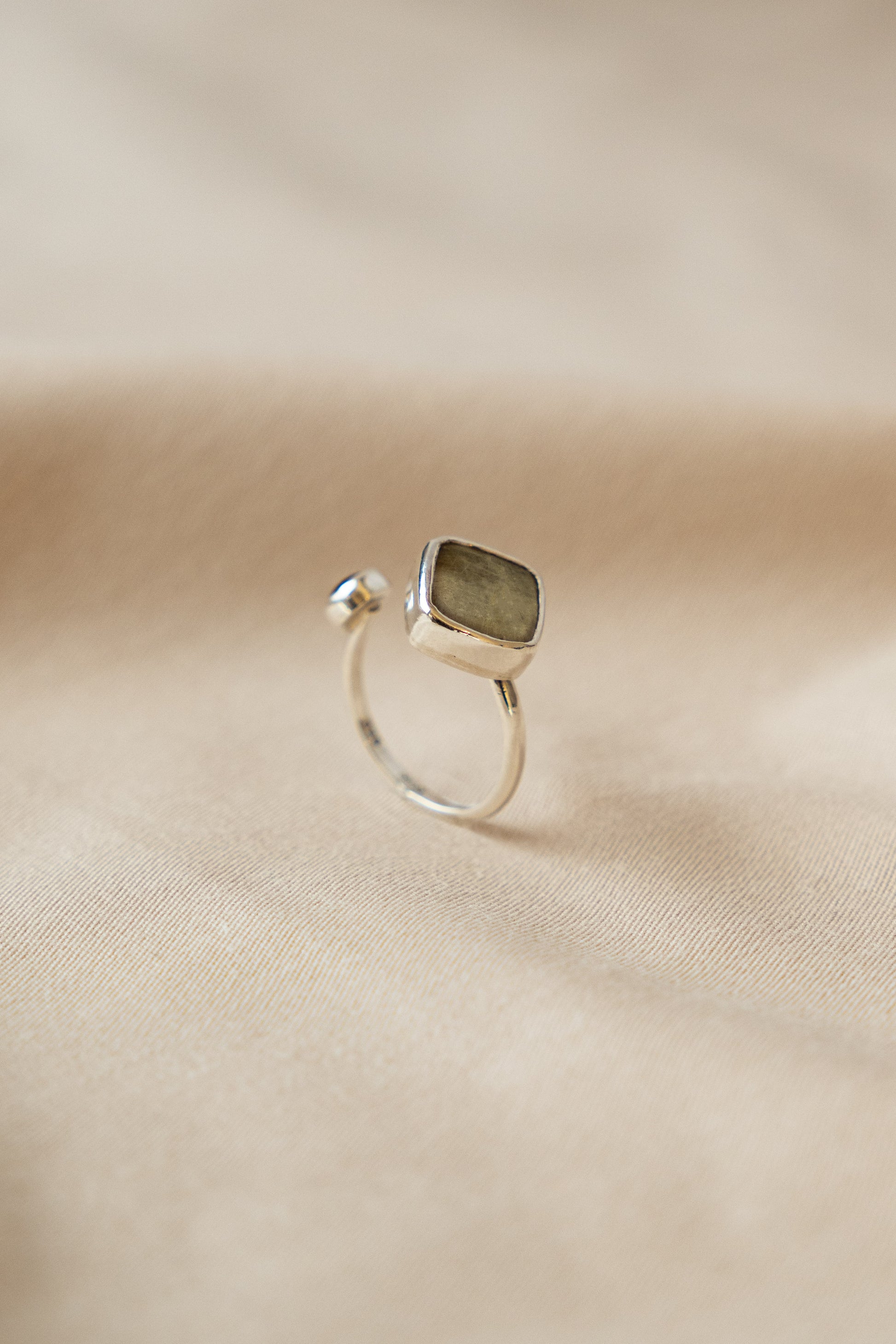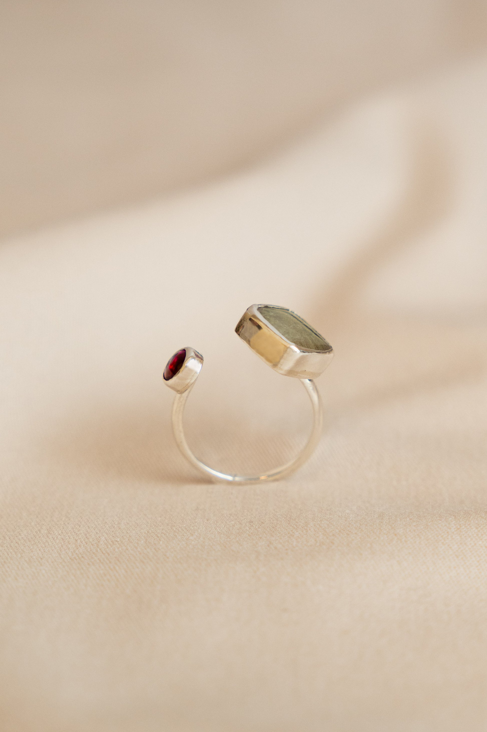 Iuxta is a two stone ring. It means "close to" and symbolizes two beings coexisting side by side, in peacefull harmony. In this version, the elements surrounded by silver are a deep magenda synthetic ruby and a white quartz with routile semi-precious stone.