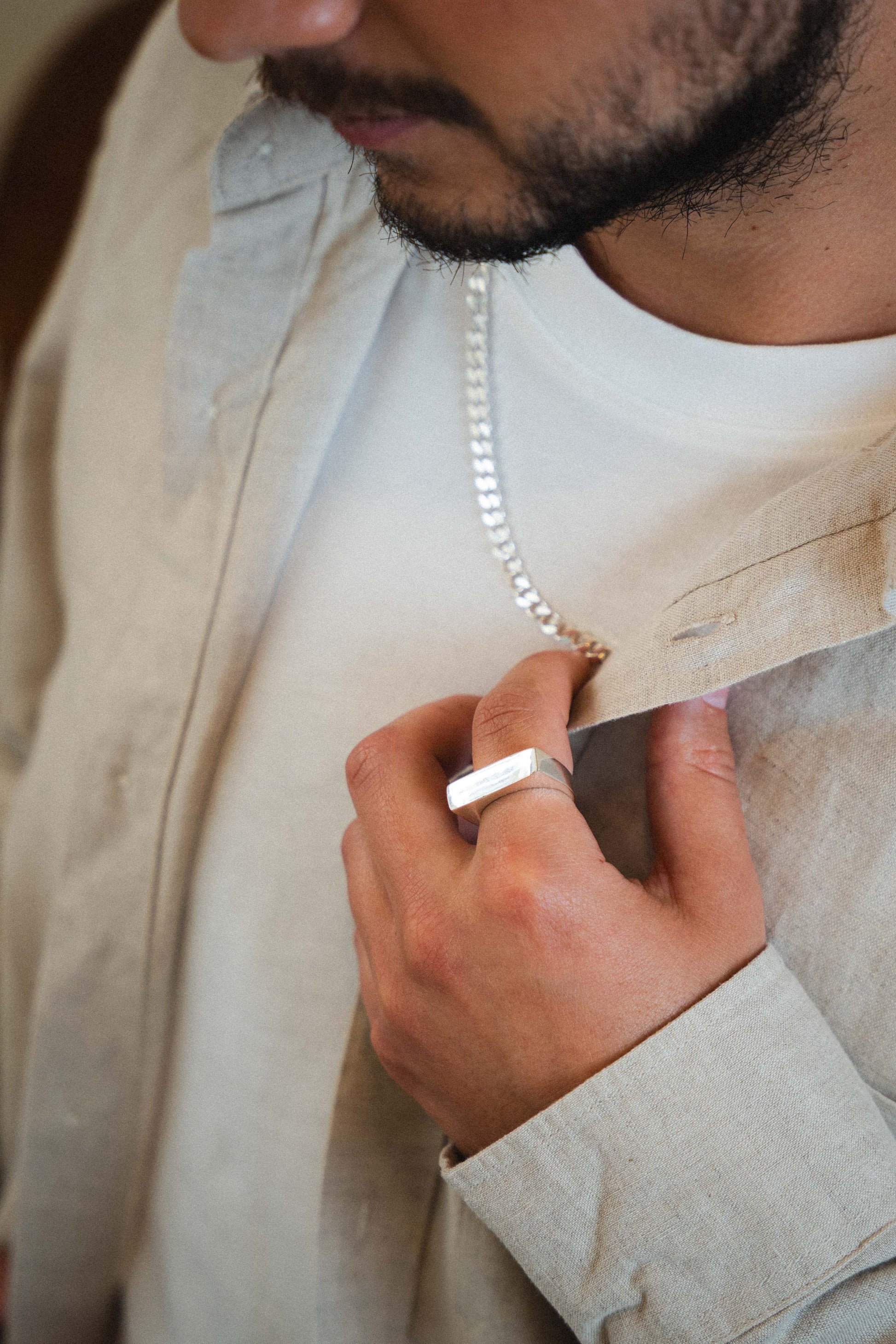 Esse is rectangle signet ring. In latin, it means "to be" and it refers to the "act of existence". Glowing quietly at the root of creation, where being simply is.